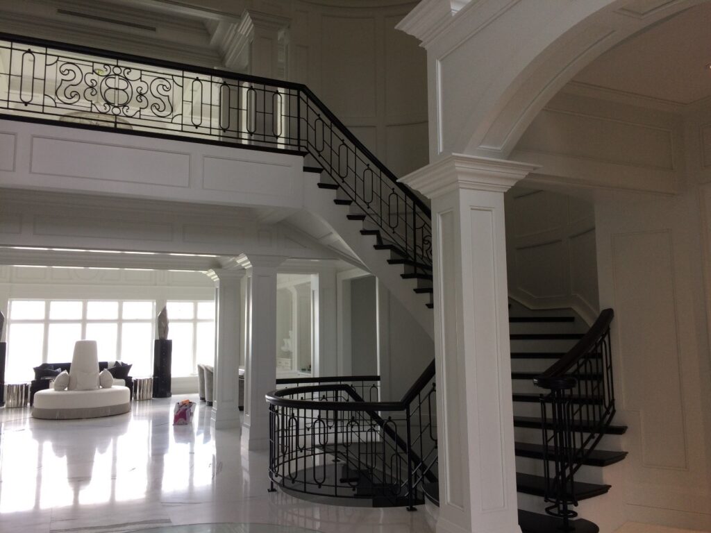 A home deserving of a grandiose welcome upon entry, the request was to make iron railings for a brand-new metal staircase the homeowner already had contracted and was partially in place already. In discussing the job during the consultation, our design expert was considering all the design angles and ultimately how form would meet function and had to raise a concern about how hollow and noisy the foyer would be with the existing custom metal staircases.