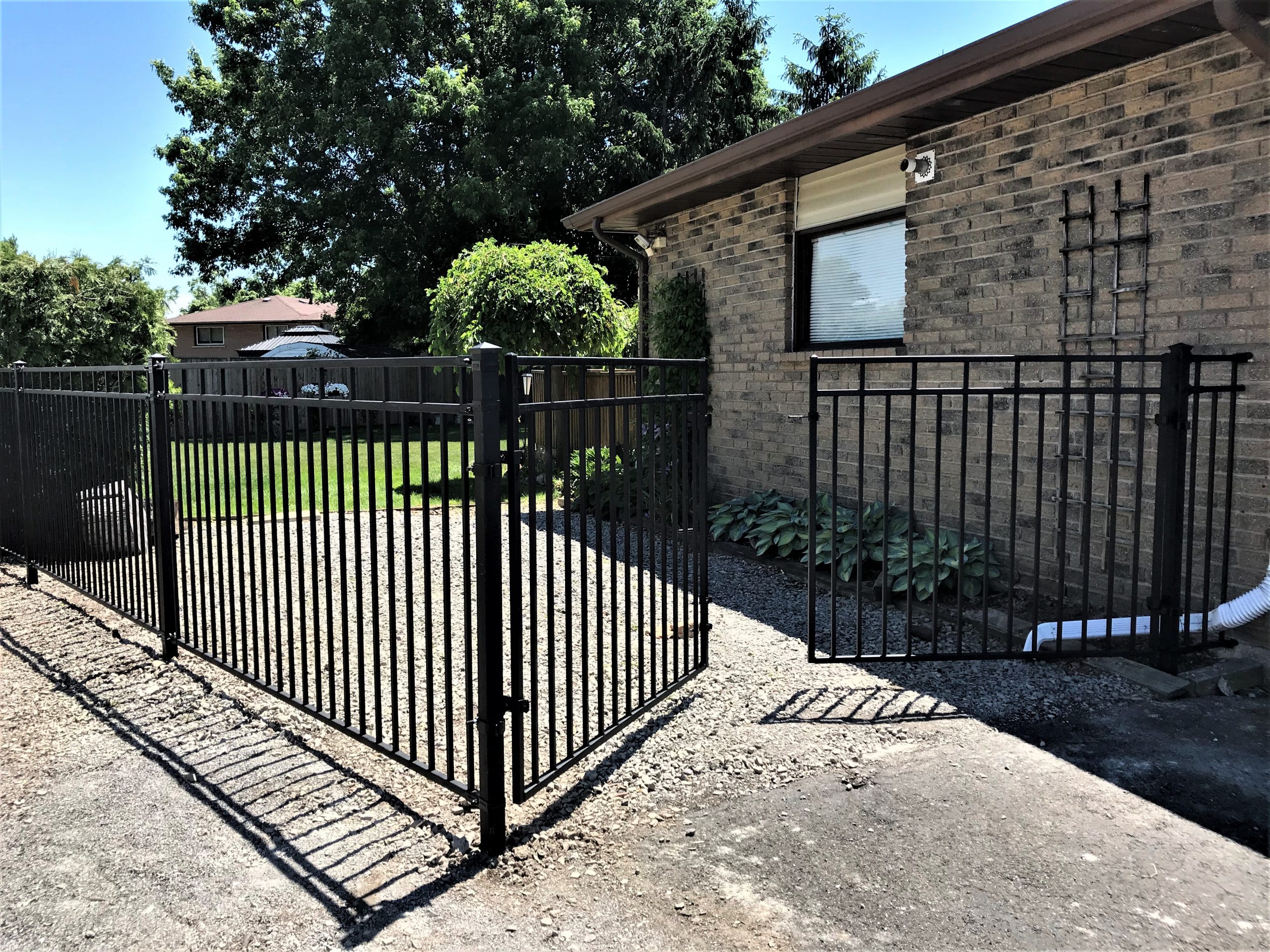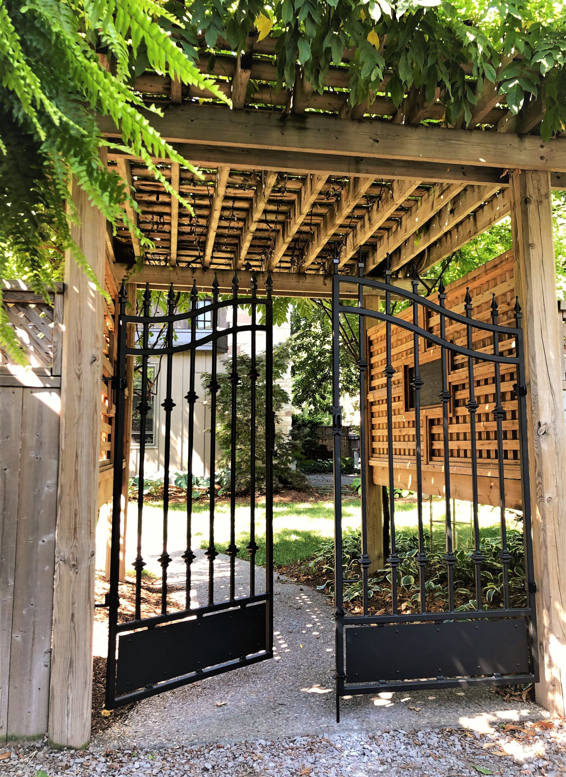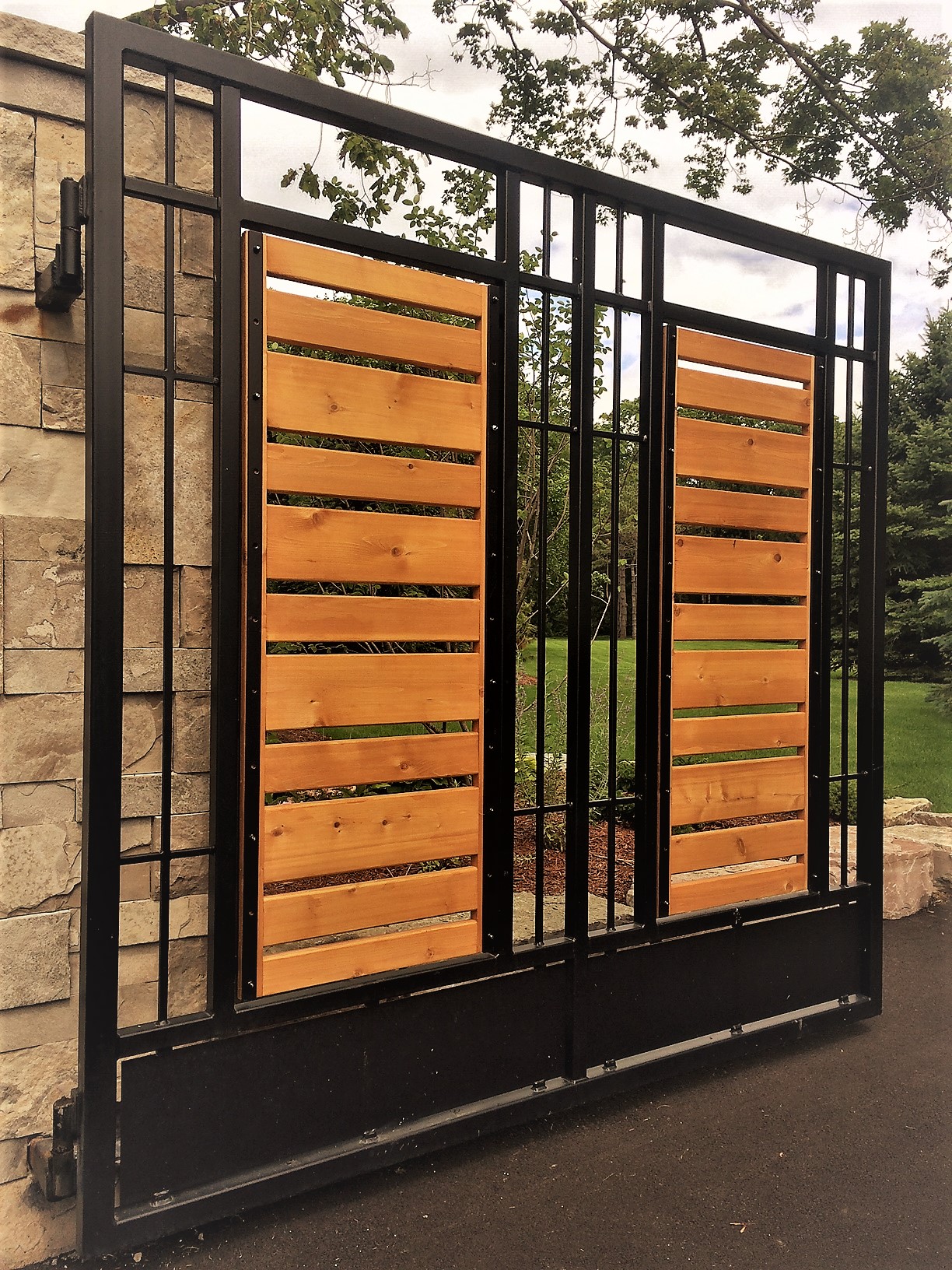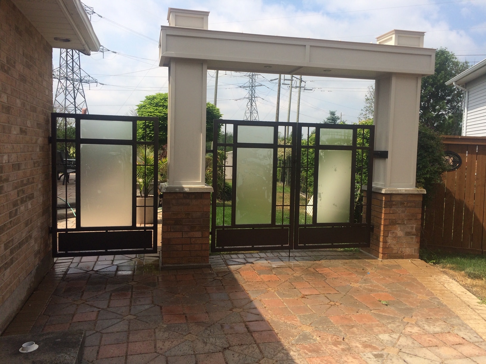 In between existing brick columns, this customer’s vision was for a gate that did not look like a point of entry, but with an entry large enough for a vehicle to pass through and it must include some glass elements. With a backyard pool in play, privacy was a priority, but not completely enclosed like Fort Knox; still allowing for a view and breezes to flow.